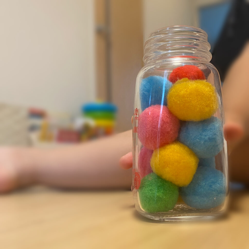 子どもってこう言う遊び好きですよね?娘も入れ物に詰めるのが好きなようです👍