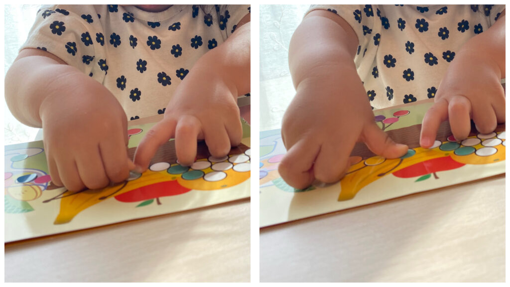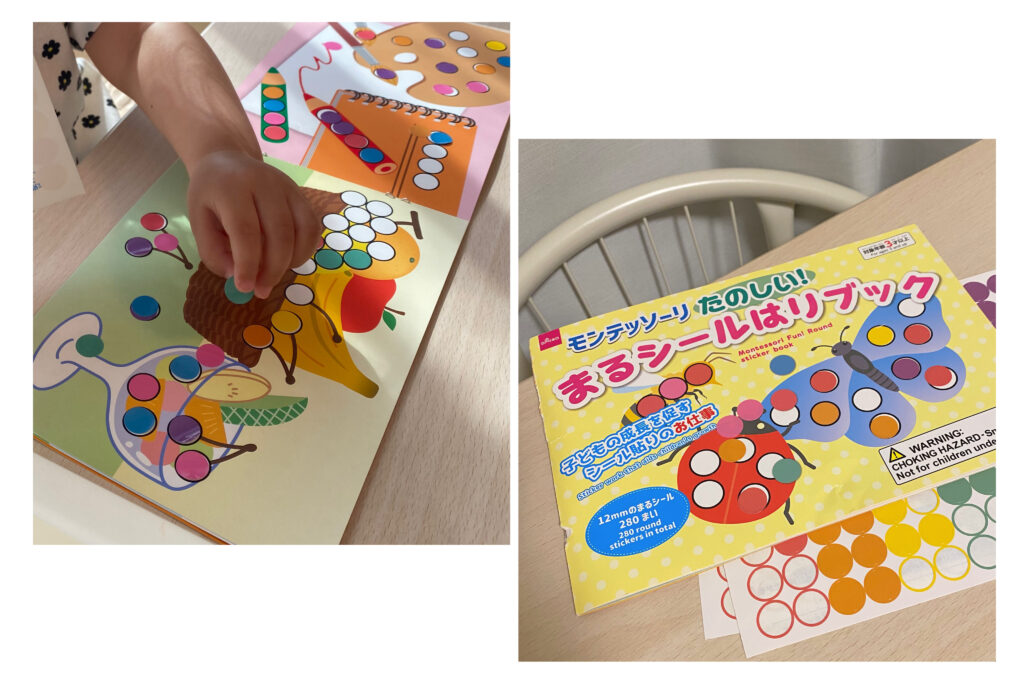 1歳後半で初めて遊んだ時は、◯の中にシールを貼るのは難しそうでした。しかし、いつの間にか◯に合わせてピッタリに貼れるようになっていて感激しました😉